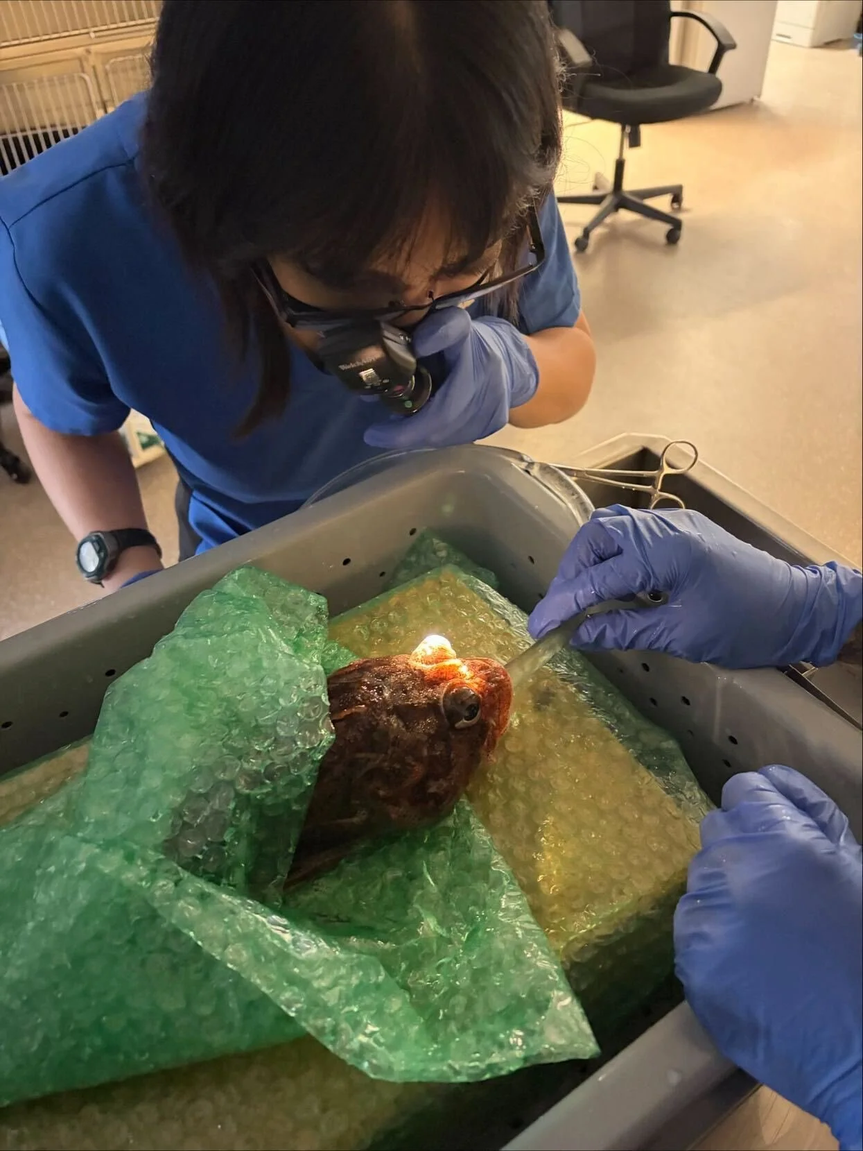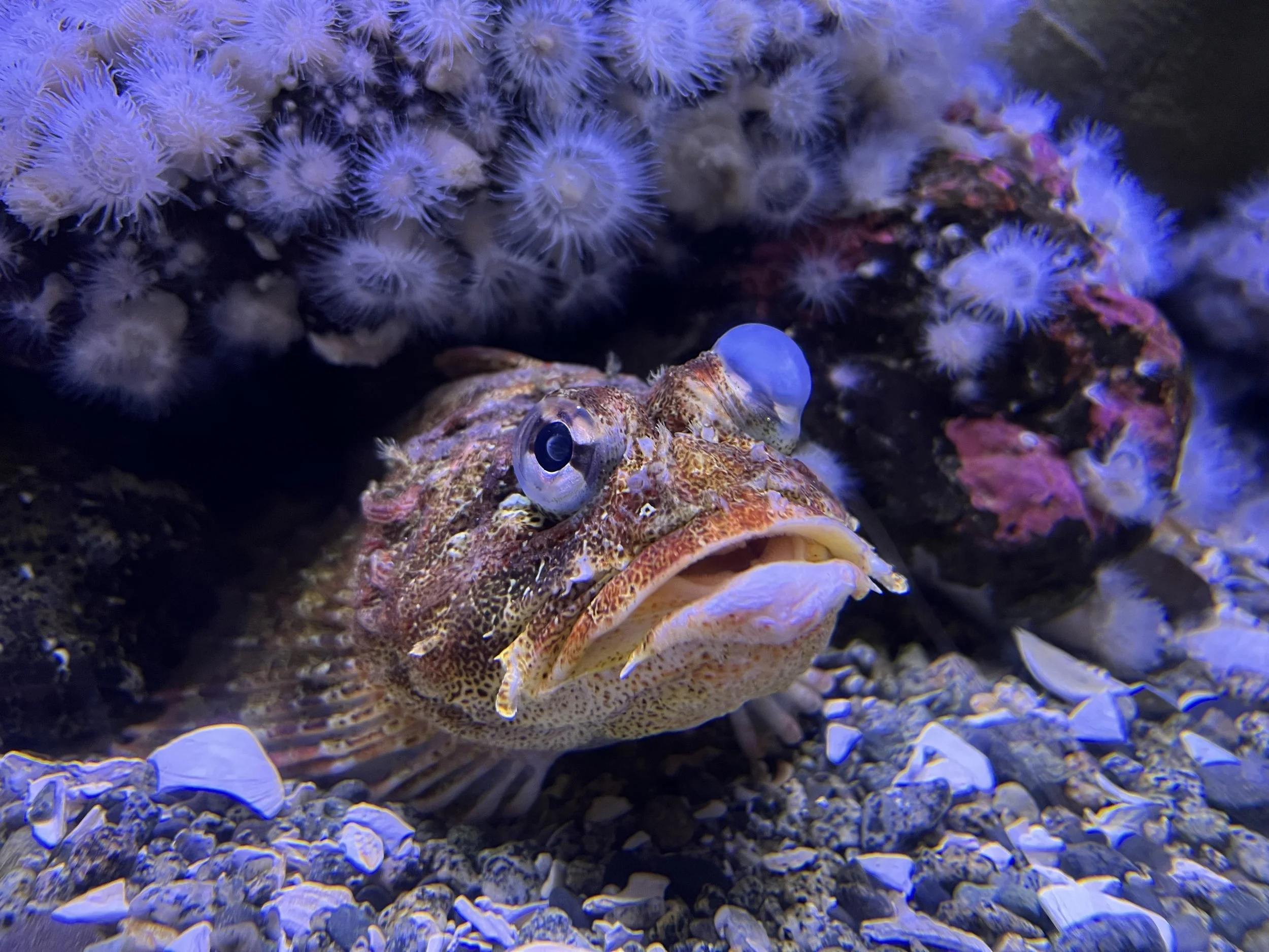 This Red Irish Lord, Dorian, has been living for many years in our Kelp Forest habitat. Recently, Dorian was found to have a swollen and irritated cornea. Our veterinarian prescribed some medication to reduce the swelling and performed a sedated ophthalmic exam to rule out ulcers, serious injury, cancer, and disease. Thankfully Dorian has none of those issues, and it is thought that the cloudy cornea will remain rather like a scar. We believe Dorian has some degree of vision loss in that eye and so they were moved to Rock Wall so we could monitor them more closely and ensure they are getting the appropriate amount of food.